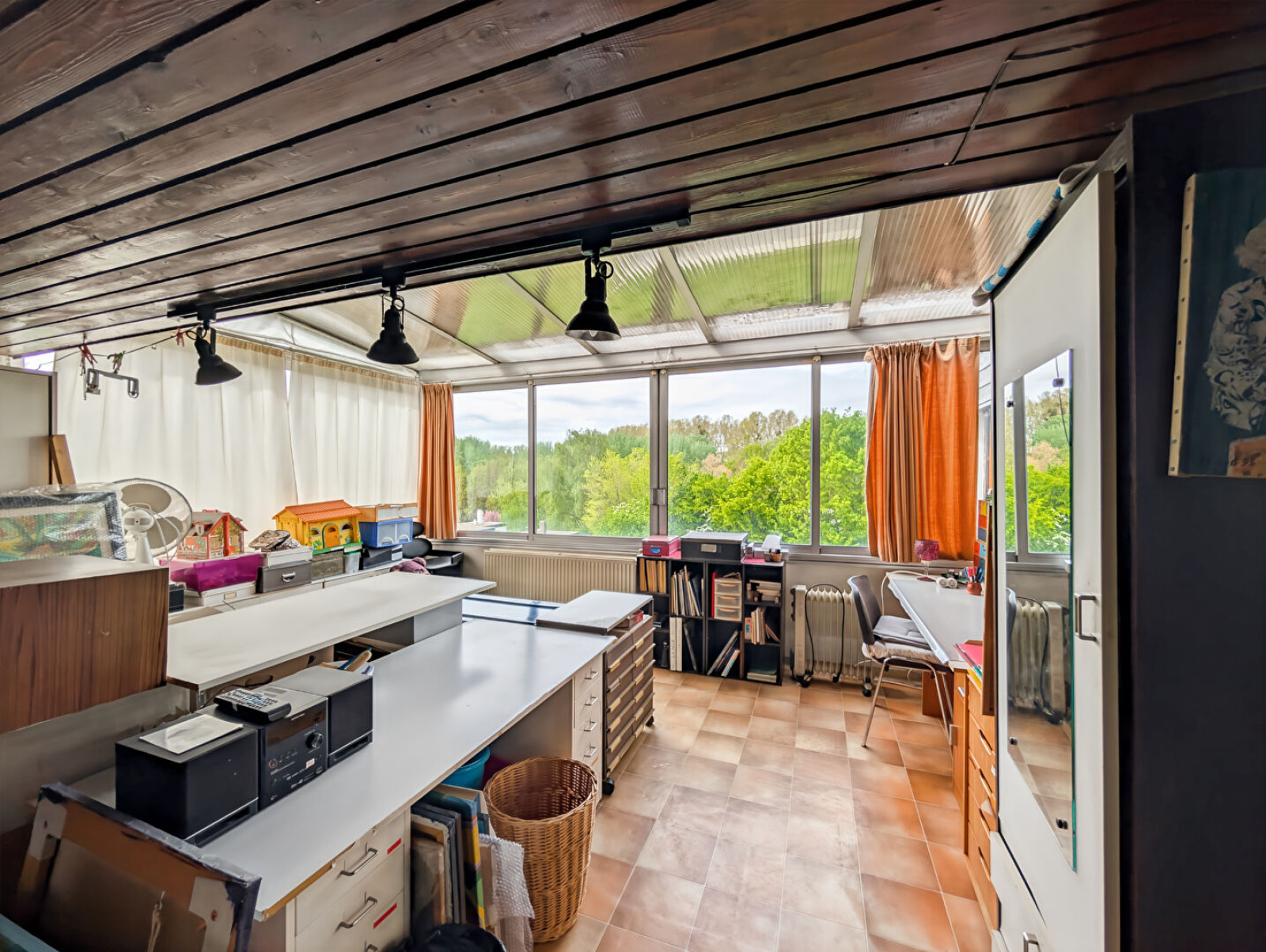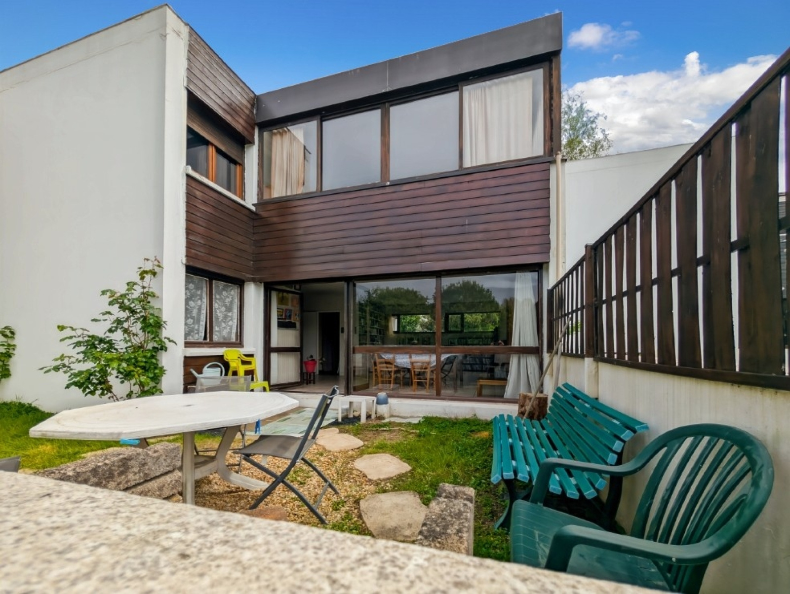 A l'étage : 3 chambres, véranda et salle de bains avec wc.